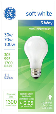 GE, 30/70/100W, 3 Way Soft White Light Bulb, A-Line A-21, Maximum Overall Length 5-1/4", Medium Base, 1500 Hours/280 Lumens @ 30W, 1200 Hours/1035 Lumens @ 70W, 1200 Hours/1315 Lumens @ 100W. vendor ID: 18655 Price/Unit: 2.69EA model: 97493