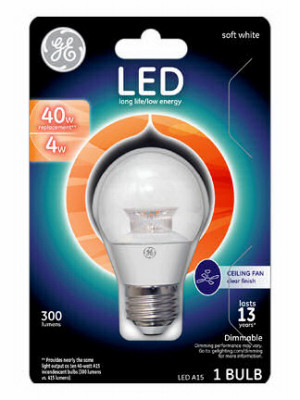 GE, LED4DA15-C3/OT, 4W, Clear, Medium Base, Dimmable, A15 Shape, LED Light Bulb, Equivalent To A 40W Incandescent, Medium Base, 300 Lumens, 2,700 Color Temperature, 3.5" MOL, 15,000 Hours Rated Life, Carded. vendor ID: 18655 Price/Unit: 8.99EA model: 37933
