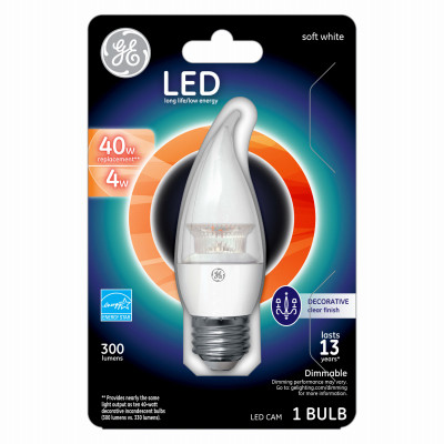 GE LED4DCAM-C3/OT, 4W, CA11 Shape, Medium Base, Clear LED Bulb, 300 Lumens, Equivalent to 40W Incandescent, 2700K Color Temperature, Overall Length = 4.3", Rated Life = 15,000 Hours, Energy Star Rated, Carded. vendor ID: 18655 Price/Unit: 5.99EA model: 37888