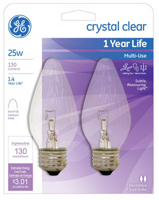 GE, 25FM/C/CF2-TP4, 2 Pack, 25W, Clear, Flame Shape Bulb, Faceted Glass, Medium Base, Overall Length: 4.12", Rated Life: 1,500 Hours. vendor ID: 18655 Price/Unit: 3.79EA model: 75337