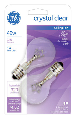 GE, 40BC/CF/CD2-TRAY, 2 Pack, 40W, 120V, Blunt Tip Ceiling Fan Bulb, Candelabra Base, B8 Bulb, 3.19" MOL, 1,500 Hours, For Use In Ceiling Fan Fixtures, Vibration Resistant, C7A Filament Design, Can Be Carded Or Used In Tray Pack. vendor ID: 18655 Price/Unit: 3.79EA model: 81561