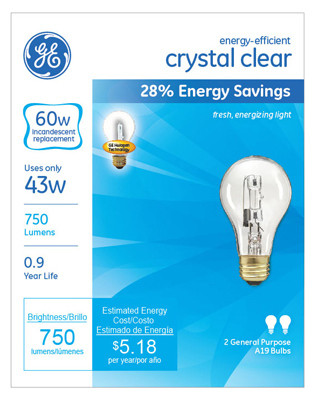 GE, 43A/CL/H-2PK, 2 Pack, 43W, Clear, A19, Halogen Light Bulb, 750 Lumens, 1,000 Hours. 4.62 Maximum Overall Length, Medium Base, Bright Crisp Light, Energy Saving. vendor ID: 18655 Price/Unit: 4.99EA model: 78796