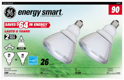 GE, FLE26/2PAR38XCD, 2 Pack, 26W, 120V, Soft White, Outdoor Compact Fluorescent Flood Light, 90W Incandescent Equivalent, Par 38 Shape, 1300 Lumens, 10,000 Hours, Starts Flicker Free, Rated For Wet Conditions, Small Ballast, Energy Star Rated, Boxed. vendor ID: 18655 Price/Unit: 16.99EA model: 73157