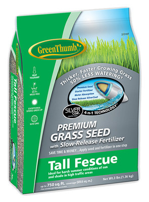 Green Thumb, 3 LB, Premium Coated Tall Fescue Seed, Drought Hardy For Transitional & South, 750 SQFT Coverage, 22% Houndog 6 Turf Type Tall Fescue, 18% Garrison Turf Type Tall Fescue,10% Jamboree Turf Type Tall Fescue, 50% Silvercoat Water Holding With Fertilizer Technology Coating Material. vendor ID: 7004 Price/Unit: 11.99EA model: GREUN230