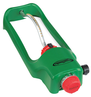 Green Thumb, Oscillating Sprinkler, Built In Timer, Metal Spray Tube, Coverage Up To 3,500 SQFT, Automatically Shuts Water Off, Dial Selects Up To 2 Hours Of Watering, On Setting For Continuous Watering, Durable Poly Construction, Spray Tube With 17 Brass Jets, Easy To Use Rotation Dials. vendor ID: 68015 Price/Unit: 24.99EA model: 7800PMTGT