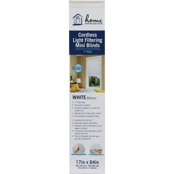 - Home Impressions 17 In. x 64 In. x 1 In. White Vinyl Light Filtering Cordless Mini Blind