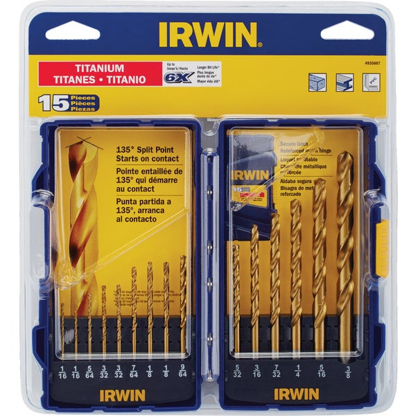 - Irwin 15-Piece Titanium Coated HHS Metal Drill Bit Set 1/16 In. thru 3/8 In.