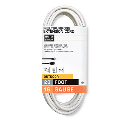 Master Electrician, 20', 16/3, SJTW, White, Outdoor Extension Cord, 13A, 125W, 1625W, UL Listed. vendor ID: 42341 Price/Unit: 10.99EA model: 02352ME01