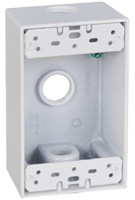 Master Electrician, White, Weatherproof, 1 Gang Rectangular Outlet Box, Three 1/2" Holes, Mounting Lugs, Closure Plugs, Ground Screws, Shrink Wrapped. vendor ID: 7720 Price/Unit: 4.99EA model: FSB50-3-W