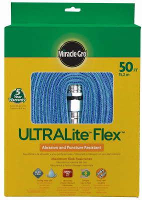 Miracle Gro, 1/2" x 50', Blue Garden Hose, Ultra Lightweight, Made With A Patented Durable Material That resists Kinking, Meets The Lead Free Standard Under The Federal Safe Drinking Water Act, Meets California's Strict Standards On The Phthalate Content Allowed For Childrens Toys, Limited Lifetime Warranty. vendor ID: 5256 Price/Unit: 39.99EA model: CMGUFB12050