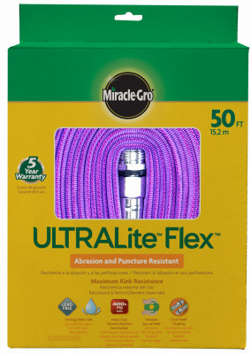 Miracle Gro, 1/2" x 50', Purple Garden Hose, Ultra Lightweight, Made With A Patented Durable Material That resists Kinking, Meets The Lead Free Standard Under The Federal Safe Drinking Water Act, Meets California's Strict Standards On The Phthalate Content Allowed For Childrens Toys, Limited Lifetime Warranty. vendor ID: 5256 Price/Unit: 39.99EA model: CMGUFP12050