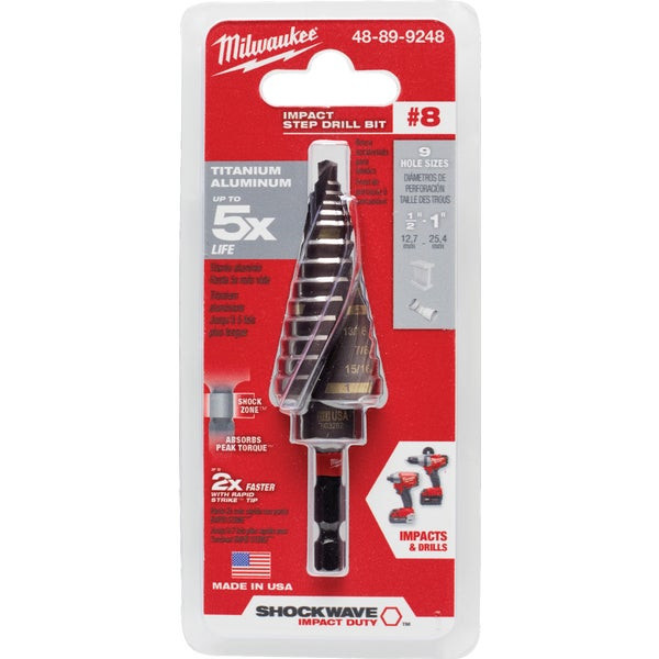 - Milwaukee Shockwave Impact Duty 1/2 In. - 1 In. #8 Step Drill Bit 9 Steps