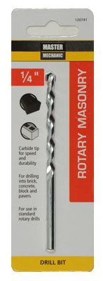 Master Mechanic, 1/4" x 4", Masonry, Drill Bit, Straight Shank, Positive Point Angle Permits Quick, Accurate Penetration, Zinc Surface Finish, Recommended For Drilling Cinder Block, Common Brick, Plaster & Ceramic Tile & For Moderate Use In Hard Brick, Glazed Tile & Dry Concrete, Carded. vendor ID: 6978 Price/Unit: 2.99EA model: 120741
