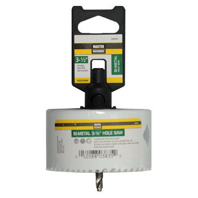 Master Mechanic, 1 Piece 3-1/2" Bi-Metal Hole Saw, M3 High Speed Steel Cutting Edge, 1-7/8" Depth Of Cut, 4/6 Variable Tooth Pattern Provides Less Vibration, Delivering Faster, Smoother Cuts Then Conventional Hole Saws, Features Built In 3/8" Mandrel Which May Be Used With 3/8" Or Larger Drill, Recommended For Cutting Soft Or Hard Wood, Nail Embedded Wood, Stainless Steel, Pipe, Rubber & Conduit, Pilot Drill Included, Carded. vendor ID: 6978 Price/Unit: 22.99EA model: 698995