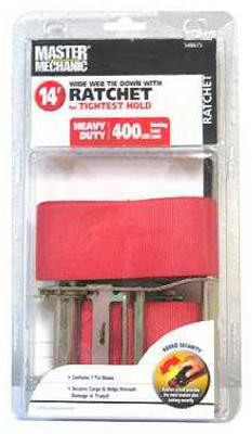 Master Mechanic, 2" x 14', Ratchet Tie Down, 1,200 LB Rated Capacity, 400 LB Working Load Limit, 2" Wide Webbing Spreads Load, Oversized Ratchet Increases Tension, Full Size, Non-Marring Vinyl Coated S-Hooks. vendor ID: 1285 Price/Unit: 15.99EA model: MM06
