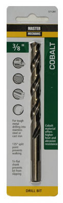 Master Mechanic, 3/8" x 5", High Speed Steel With Cobalt Drill Bit, 135 Split Point, Jobber Length, 3/8" Shank, 135 Split Point Design With 4 Cutting Edges Allows Quick Penetration & Eliminates Walking, 8 Percent Cobalt Content Provides Heat Resistance & Delivers Maximum Cutting Efficiency At Temperatures In Excess Of 1000 Degree Fahrenheit, Recommended For Drilling In Hard Metals Such As Heat Treated Steel, Stainless Steel, Chrome, Manganese Steel Plus Titanium & Armor Plate, Carded. vendor ID: 6978 Price/Unit: 11.99EA model: 571281