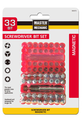 Master Mechanic, 33 Piece, Screwdriver Bit Set, Includes 1 Each Of 1" Phillips Bit #1,#2, #3, 1" Slotted #3-4,#6-8,#8-10,#10-12, 2 Each 1" Drywall Bit, 1 Each 1" Star #T8,T9,T10,T15,T20,T25,T27,T30,T40, 1 Each 1" Posidriv #PZ0, PZ1, PZ2, PZ3, 1 Each Hex #H2, H2.5, H3, H4, H5, H5.5, H6, Magnetic 3" Bit Holder, Plastic Case. vendor ID: 6978 Price/Unit: 11.99EA model: 693575