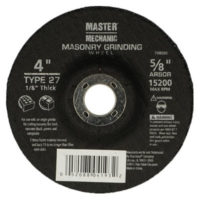 Master Mechanic, 4" x 1/8" x 5/8" Arbor, Masonry Depressed Center Cutting Wheel, Double Reinforced With Industrial Grit & Glue For Increased Life & Durability, Superior Friability Allows Wheel To Break Down Quickly, Consistently Exposing New Grain For Increased Sharpness & Longer Life, For Low Angle & Vertical Grinding, Max RPM Rating 15,200. vendor ID: 6978 Price/Unit: 2.99EA model: 768096
