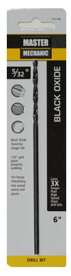 Master Mechanic, 5/32" x 6", Extra Length, High Speed Steel, Black Oxide Drill Bit, 135 Point Angle With 4 Cutting Edges Which Eliminate Walking & Provide Fast Penetration, Black Oxide Tempering Treatment Reduces Frictional Resistance & Improves Chip Flow, Recommended For Wood, Plastic, Wallboard, Plywood & Soft Metals, Aluminum, Brass, & Bronze, For Occasional Use In Stainless Steel & Other Hard Metals, Carded. vendor ID: 6978 Price/Unit: 6.79EA model: 571158