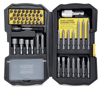 Master Mechanic, 54 Piece, Driver Bit Set, Includes: 1" Screwdriver Bits, Phillips 1 Of: P1, P3, 7 Of: P2, Slotted 1 Of: 4-6, 6-8, 8-10, Square (Robertson), 1 Of: SQ1, SQ3, 2 Of: SQ2, Allen/Hex 1 Of: 5/64, 3/32, 7/64, 1/8, 9/64, 5/32, 3/16, 7/32, Star (Torx) 1 Of: #10, #15, #20, #27, #30, #40, 2 Of: #25, 2" Screwdriver Bits, Phillips 1 Of: P1, P3, 2 Of: P2, Slotted 1 Of: 6-8, 8-10, Square (Robertson) 1 Of: SQ1, 2 Of: SQ2, Star (Torx) 1 Of: #20, 2 Of: #25, 3" Screwdriver Bits, Phillips 1 Of: P1, P2, Square (Robertson) 1 Of: SQ2, Nut Drivers 1 Of: 1/4", 5/16", 3/8", 7/16", 3" High Torque/Torsion Magnetic Bit Holder & 1/4" Quick Change Single Spring Connector, Orgainzed In A Durable Case, Clamshell. vendor ID: 6978 Price/Unit: 19.99EA model: 140101