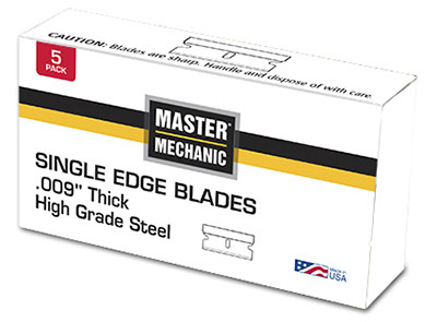 Master Mechanic, 5 Pack, Single Edge Razor Blade, .009" High Carbon Steel, 5 Blades Per Box, 100 Boxes Per Display. vendor ID: 4051 Price/Unit: 1.49EA model: 741355