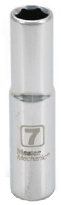 Master Mechanic, 1/4" Drive, 7 mm, 6 Point, Deep Well Socket, Chrome Vanadium Steel, Surface Drive, Design Contacts The Flat Surfaces On Fastener Instead Of Corners, Reduces Slippage, Reduces Rounding Of Fastener & Will Still Grab On Slightly Rounded Fasteners. vendor ID: 4469 Price/Unit: 3.19EA model: 213614