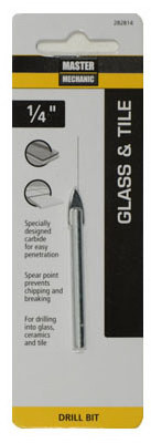 Master Mechanic, 1/4" x 2-1/4", Glass & Tile, Carbide Tipped Drill Bit, Standard Shank, Spear Pointed Tip Reduces Breakouts When Drilling From 1 Side To The Other, May Be Used With Any 3/8" Drill Press Or Variable Speed Drill, Zinc Finish, Recommended For Use In Ceramic Tile, Mirrors Or Glass Of All Types, Marble, Tile, Vitrolite & China, Carded. vendor ID: 6978 Price/Unit: 9.99EA model: 282814