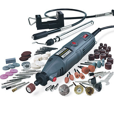 Master Mechanic, 100 Piece, 1.3A Rotary Tool Kit, 10,000 - 35,000 RPM, Slide Switch, Externally Replaceable Brushes, Dremel Compatible Housing & Collet Nut Threads, Hanger Ring, 6' Power Cord, Accessory Kit Includes: Flexible Shaft With Auto Spindle Lock, C-Clamp With Extendable Stand, General Purpose Accessory Kit & Plastic Case. vendor ID: 4543 Price/Unit: 39.99EA model: 152294