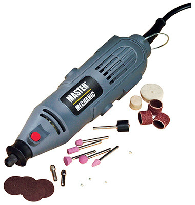 Master Mechanic, 24 Piece, 120V, 1.2A Rotary Tool Kit, 10,000 - 35,000 RPM With Variable Speed Dial, Separate On/Off Switch, Externally Replaceable Carbon Brushes, Spindle Lock, Metal Hanging Loop, 6' Power Cord, Dremel Compatible Housing & Collet Threads, Includes 1 Each Of The Following: 1/2" Felt Polishing Wheel, 1" Felt Polishing Wheel, 1/8" Mandrel, 1/8" Shank Drum Sander, 1/8" Screw Mandrel, 1/8" Collet, 3/32" Collet, Wrench & 3 Each 19/32" Sanding Band, 5 Each 3/4" Sanding Disc, 4 Each 15/16" Cut Off Wheel, 5 Each Grinding Stones, Assorted Shapes & Sizes. vendor ID: 4543 Price/Unit: 19.99EA model: 151369