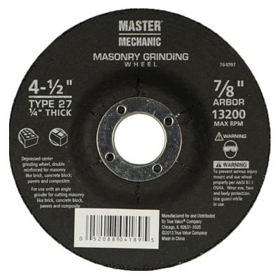 Master Mechanic, 4-1/2" x 1/4" x 7/8" Arbor, Masonry Depressed Center Grinding Wheel, Double Reinforced With Industrial Grit & Glue For Increased Life & Durability, Superior Friability Allows Wheel To Break Down Quickly, Consistently Exposing New Grain For Increased Sharpness & Longer Life, For Low Angle & Vertical Grinding, Max RPM Rating 13,300. vendor ID: 6978 Price/Unit: 3.49EA model: 764897