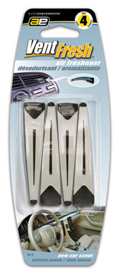 Vent Fresh, New Car Scent, Vent Auto Air Freshener, Lasts Up To 45 Days, Tab Activates The Unit & Adjustable Fragrance Dial. vendor ID: 5361 Price/Unit: 2.99EA model: VNT-22