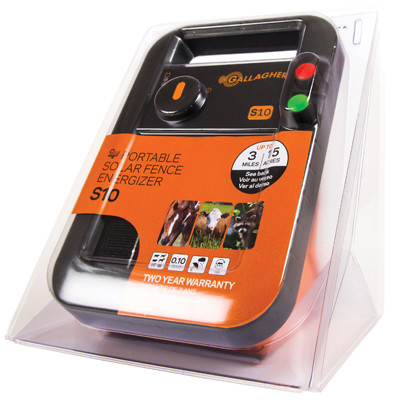 S10, Solar Fence Charger, 0.1 Joules Stored Low Impedance Power, Powers Up To 15 Acres, 3 Miles, Of Multi-Wire Fencing, Ideal For Garden Protection, Temporary Grazing Applications, Livestock & Pet Containment, Automatically Slows Down At Night, Built In Lightning Protection, Designed For All Weather Conditions, Will Work 3 Weeks Without Sun. vendor ID: 7758 Price/Unit: 129.00EA model: G341404