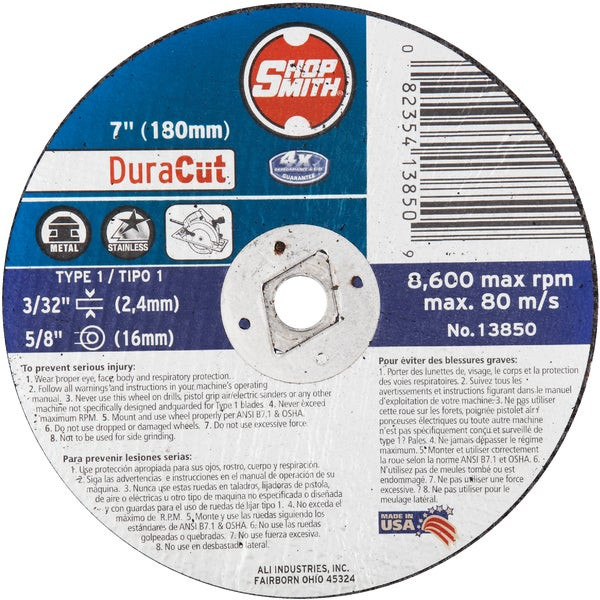 Click the button below to add the Shop Smith DuraCut Type 1 7 In. x 3/32 In. x 5/8 In. Metal/Stainless Cut-Off Wheel to your wish list.
