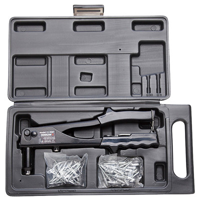 All Steel Construction Rivet Tool Kit, Strong, Non-Slip Vinyl Grip, Plus 25 Medium 1/8" 3 mm Aluminum Rivets, 25 Medium 3/16" 5 mm Aluminum Rivets, Custom Molded Case, Spring Loaded Handle For Easy Loading, Includes Interchangeable Nose Piece, Not Recommended For 3/16" All Steel Rivets. vendor ID: 158 Price/Unit: 13.99EA model: RL100K