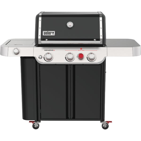 Genesis SP-E-335 LP gas grill. Features 3 high-performance PureBlu 39 000 BTU burners and 2 side tables for easy prep and serve. Includes 513 square inches of primary cooking space 156 square inches of warming rack surface pull out grease management system and 9mm stainless steel cooking grates.
