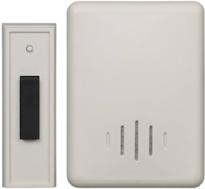 Economy, Off White, Wireless Battery Chime System, Includes 1 Battery Operated Receiver & 1 Battery Operated Button, Up To 75' Range, 32 Frequency Codes, Different Sounds For Front & Back Door, Button Uses Two 3V Cell Batteries, Included, Compact Receiver Uses 3 "AAA" Batteries, Not Included, System Works With Carlon Wireless Chimes Only, Not Doorbell Systems. vendor ID: 17418 Price/Unit: 15.99EA model: RC3105