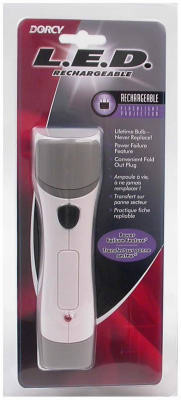 White, LED Rechargeable Flashlight, With Built In Charging Adapter, Convenient Fold Out Charging Adapter, Multi Function Switch: On, Off & Flash, Power Failure Feature, When In The Flash Mode If Your Power Fails The Light Will Flash On & Off, Plug Must Be Folded Into The Unit In Order To Operate. vendor ID: 36368 Price/Unit: 16.99EA model: 41-1045