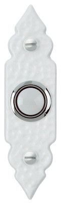 White, Lighted Door Chime Button, White Push Button With Silver Rim On White Hammered Design Wrought Iron Decorative Housing, 1-1/8"W x 3-7/8"H x 7/8"D, Flush Mounted Hardwired, For Use With Wired Chimes, Buzzers & Bells, 8-24V, Fits Brick Molding, Clam Shell Pack. vendor ID: 17418 Price/Unit: 4.99EA model: DH1612L